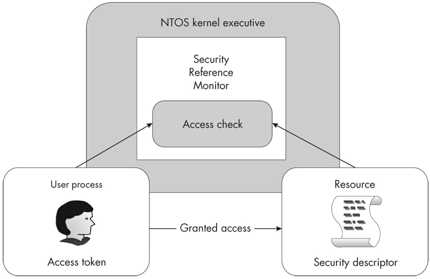 Every process running on the system is assigned an access token when it’s created. This access token is managed by the SRM and defines the identity of the user associated with that process. The SRM can then perform an operation called an access check. This operation queries a resource’s security descriptor, compares it to the process’s access token, and either calculates the level of granted access or indicates that access is denied to the caller.